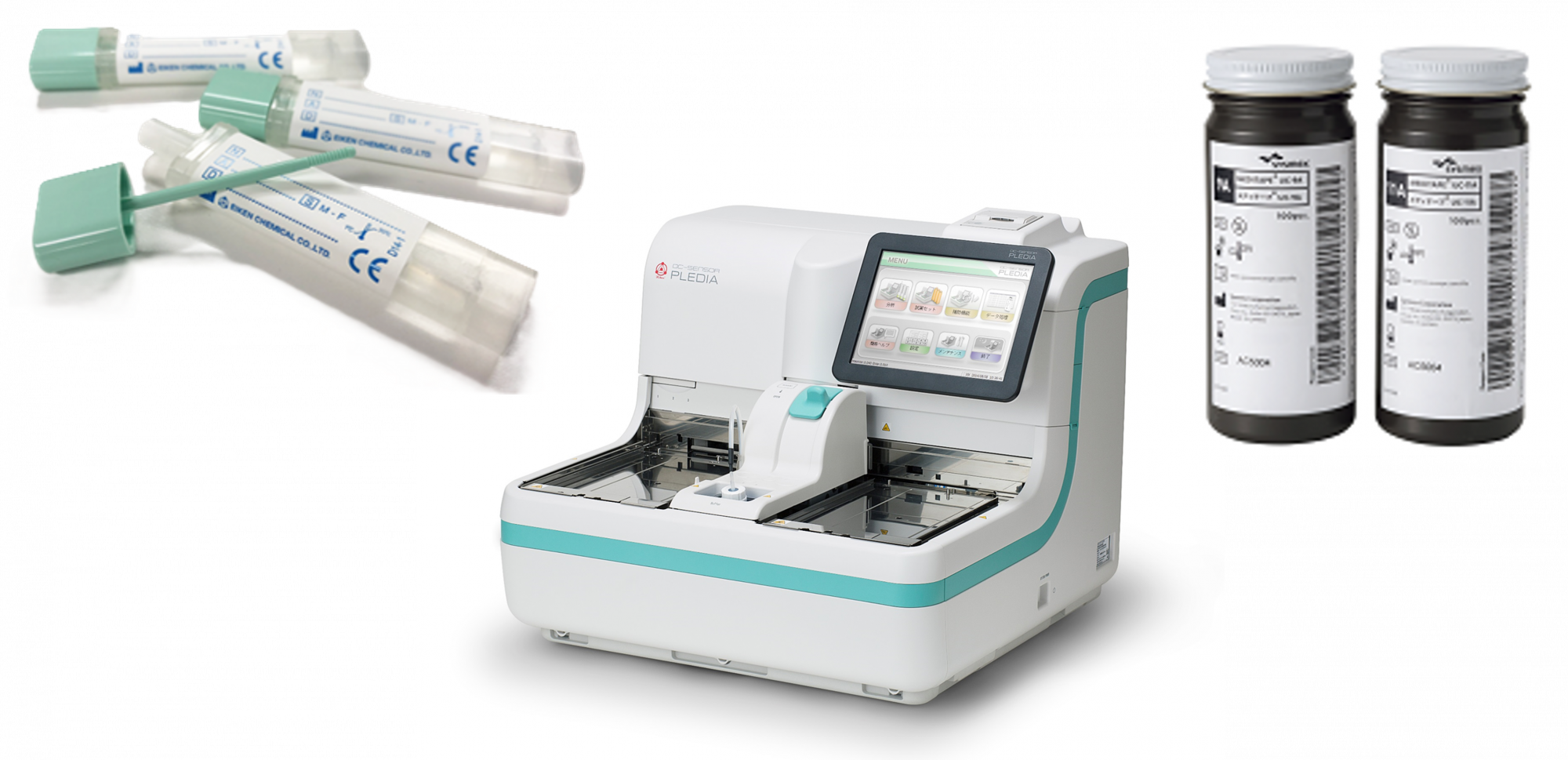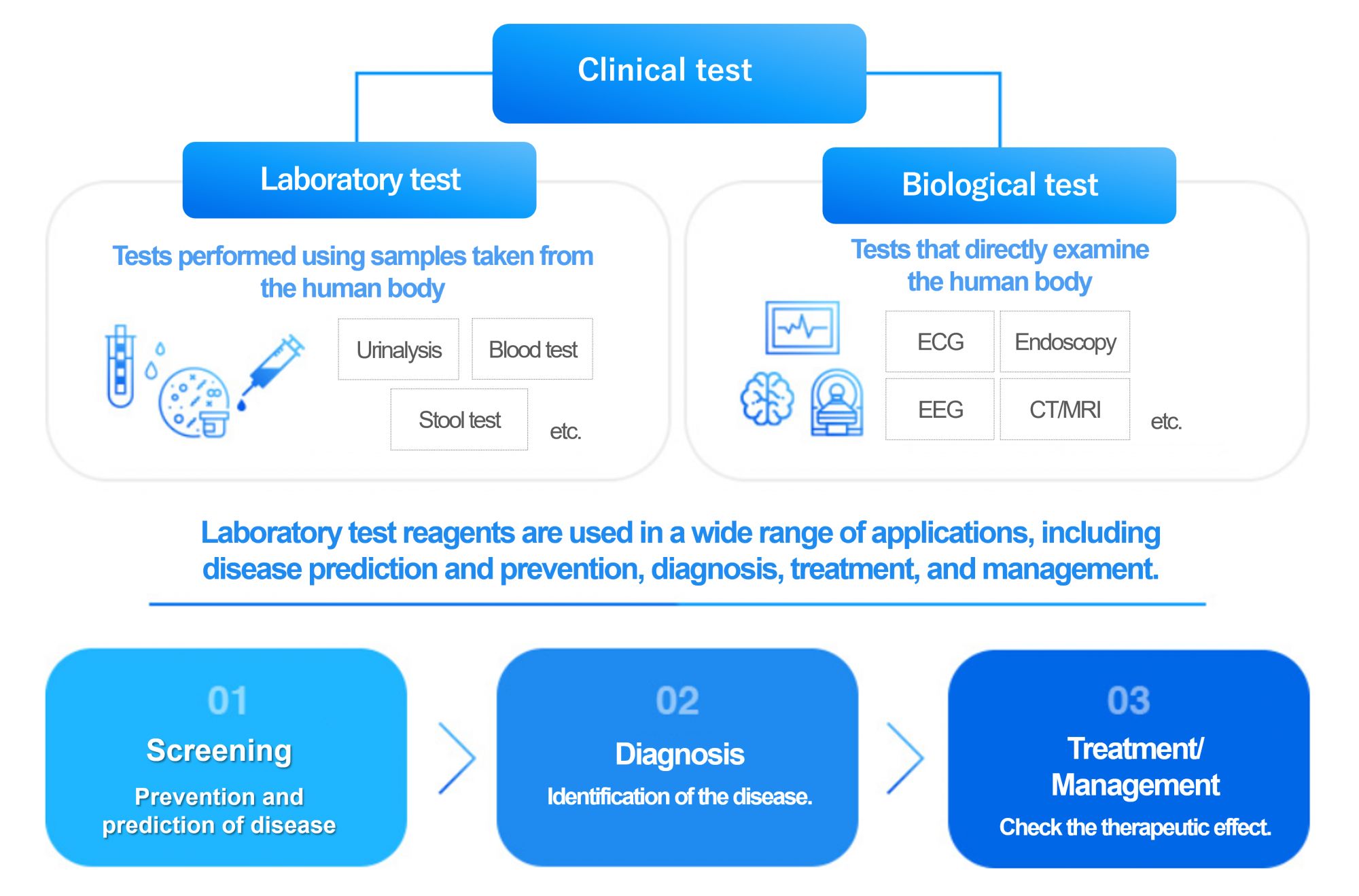 Clinical diagnostics are a kind of test used in diagnosis, treatment, and screening of disease, and can be categorized into laboratory tests and physiological function tests. As a comprehensive manufacturer of clinical diagnostics, Eiken Chemical responds to the needs of the most advanced medicine through the research and development, manufacturing and sales of products and services that cover a wide range of laboratory tests
