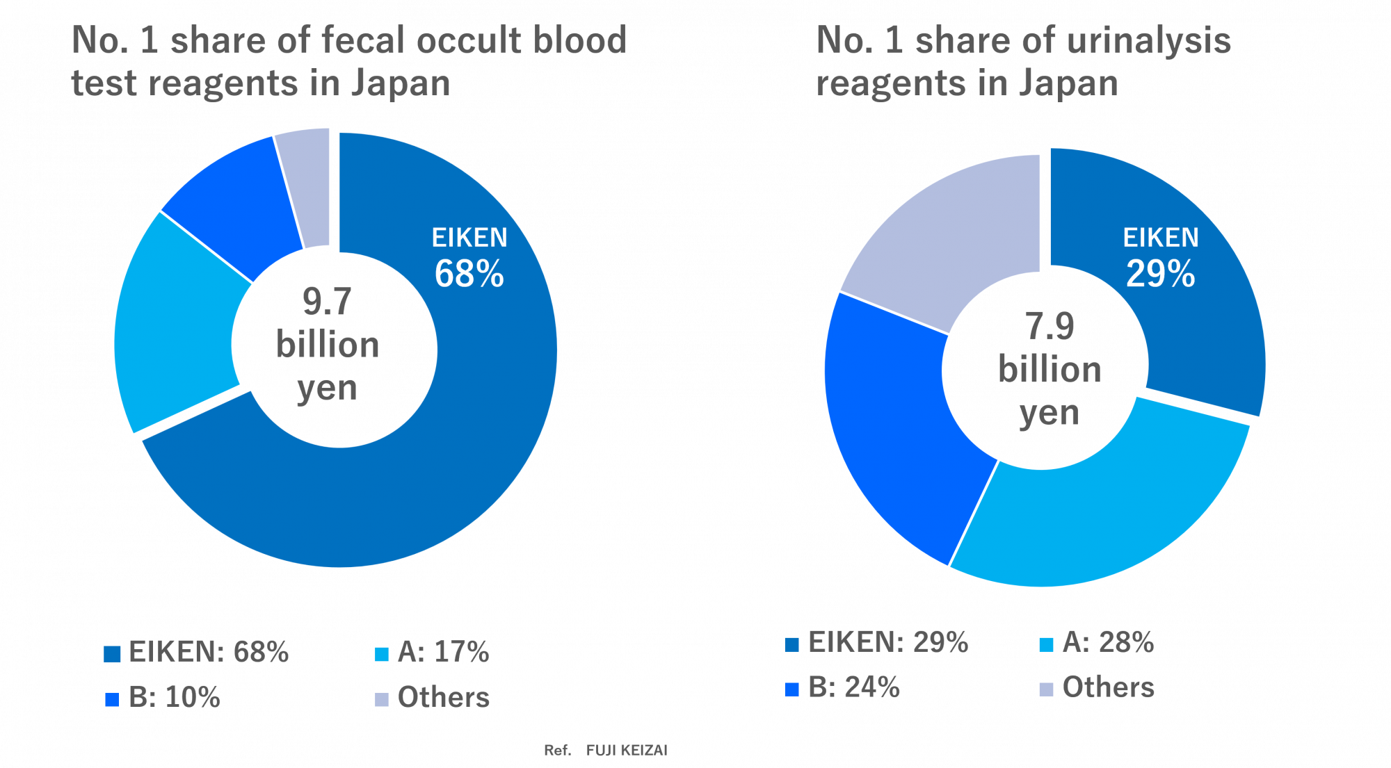 Eiken Chemical continues to grow steadily by launching new products and improving existing ones to meet market needs. Overseas sales are also increasing, driven by global expansion and adoption of our products in national colorectal cancer screening programs.