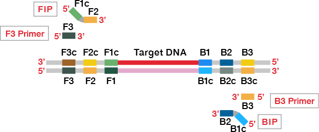 It is characterized by the use of 4 different primers specifically designed to recognize 6 distinct regions on the target gene and the reaction process proceeds at a constant temperature using strand displacement reaction. Amplification and detection of gene can be completed in a single step, by incubating the mixture of samples, primers, DNA polymerase with strand displacement activity and substrates at a constant temperature (about 65°C).
