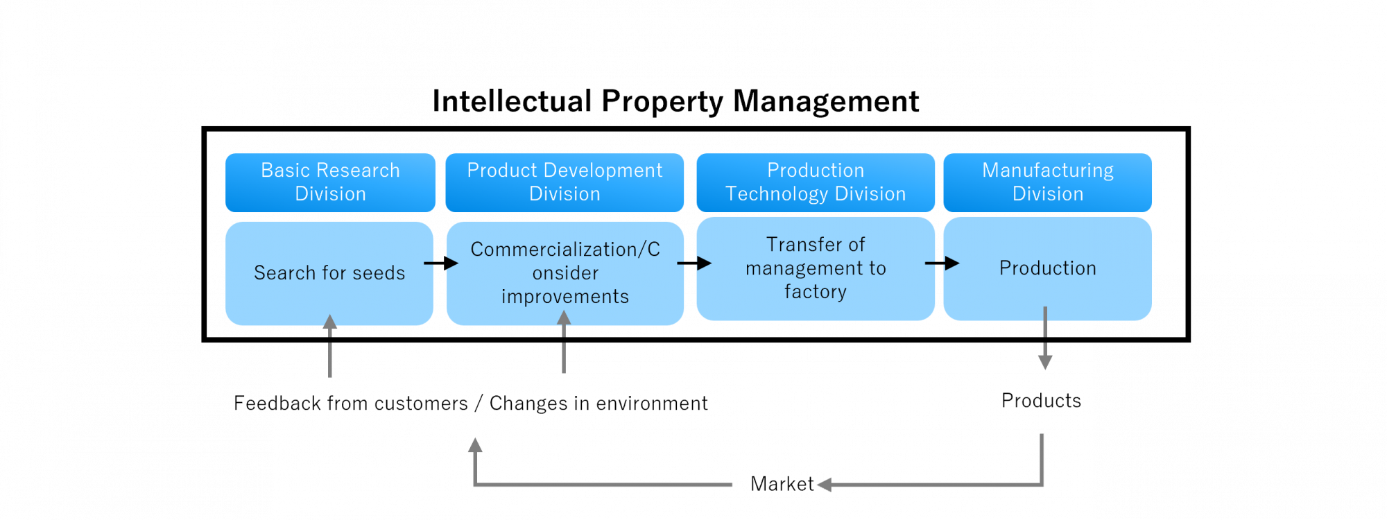 By continuously managing and renewing the intellectual property rights it has acquired to maximize their value, the Company works to increase the value of the business. The Company will also implement timely reviews of its intellectual property rights in response to changes in technologies and markets, and consider the optimal policy for their protection.
