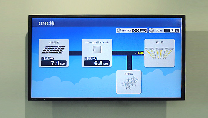 Solar panels were installed on the roofs of the Nogi Division’s Operation Management Center (OMC) , Dried Product Plant (DPP) facilities and R&D Centre, and they currently generate approximately 8,000 kWh per month on average. In addition, a monitor displaying a visualization of power generation conditions was installed. This real-time display spreads information about power generation and increases awareness of energy conservation.