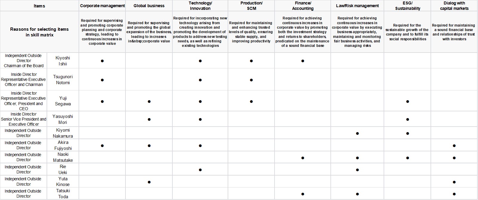 The composition of the Board of Directors of Eiken Chemical is well balanced in terms of knowledge, skills and experience in global business and sustainability, as required to achieve the Company’s management policy and management plans based on the management vision. Its members were selected with an emphasis on diversity, including diversity of gender, nationality, professional background and age. Nominees for in-house director are chosen for their ability to fulfill the roles of deciding important matters of corporate management and supervision of executive officers in the execution of their duties. Outside directors are nominated for highly specialized knowledge, skills and abundance of experience that cannot be obtained from in-house directors alone. Each director is expected to leverage his or her capabilities born of experience to maximum effect to decide important matters of basic management policy and supervise the execution of duties.
