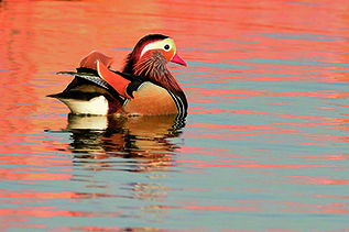 オシドリの雄です。仲の良い夫婦を「オシドリ夫婦」と呼びますが、その由来となったのがこの鳥です。ただし、オシドリを含むカモ類は毎年ペアを替え、繁殖期が終わると夫婦関係は解消されます。そもそも鳥類には一夫一婦制の種が多く、相手が死ぬまで添い遂げるものも少なくありません。「オシドリ夫婦」というイメージは、美しいオシドリにそうあってほしいという、人間の願望から生まれたものなのかもしれません。
