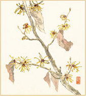 まんさくに初めて出会ったのは、秋の神代植物公園の事務所のあるほうの庭であった。黄や橙色に見事に色づいた紅葉が美しく、思わず見とれて色紙に描きとった。それを書斎の机の傍に掲げているのを弟が見て、「これは趣があっていいな」と言ってくれた。実は、塚山公園に一本だけある「まんさく」を見つけたのも、秋に紅葉の葉が目印となった。