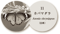 カバマダラが属するマダラチョウ科の蝶たちは、体にある種の毒を持つので、鳥たちは嫌って食べません。そのため、自然界ではこのマダラチョウ科の蝶たちに形や色を似せた蝶もあるくらいです(ベイツ型擬態)。ちなみに、身近に見るツマグロヒョウモンのメスはこのカバマダラに擬態していると考えられています。また、マダラチョウ科の蝶たちはとても飛翔力が強くて、中には鳥のように「渡り」をするものもあります。例えば、本州でも良く見かけるアサギマダラという蝶は、近年のマーキング調査によれば、秋には本州から暖かい沖縄に渡ることが知られてきました。また、北米のオオカバマダラという蝶は、3000km以上の距離を渡ることで有名です。