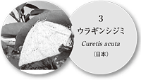 ウラギンシジミは翅裏全体が銀白色、でも翅を開くと鮮やかなオレンジの紋が拡がっていて驚きます。このチョウは夏ごろから出現し、まるでフラッシュが点滅するかのように銀色の翅をはためかせながら飛翔する姿が道路脇や林縁の梢で見られます。晩秋になって気温が下がると、常緑広葉樹(柑橘類やカシ、アオキなど)の葉裏で成虫越冬しますが、昆虫の姿を見ることが少ない冬期に、雑木林や公園を散歩していて偶然にこのチョウを発見すると、まるで宝物でも見つけたかのように嬉しくなります。