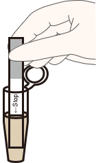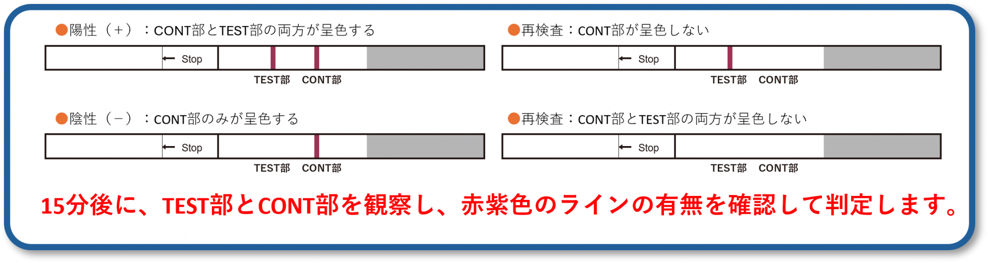 ● スティックタイプのイムノクロマトキットで、赤紫色の線の有無で判定