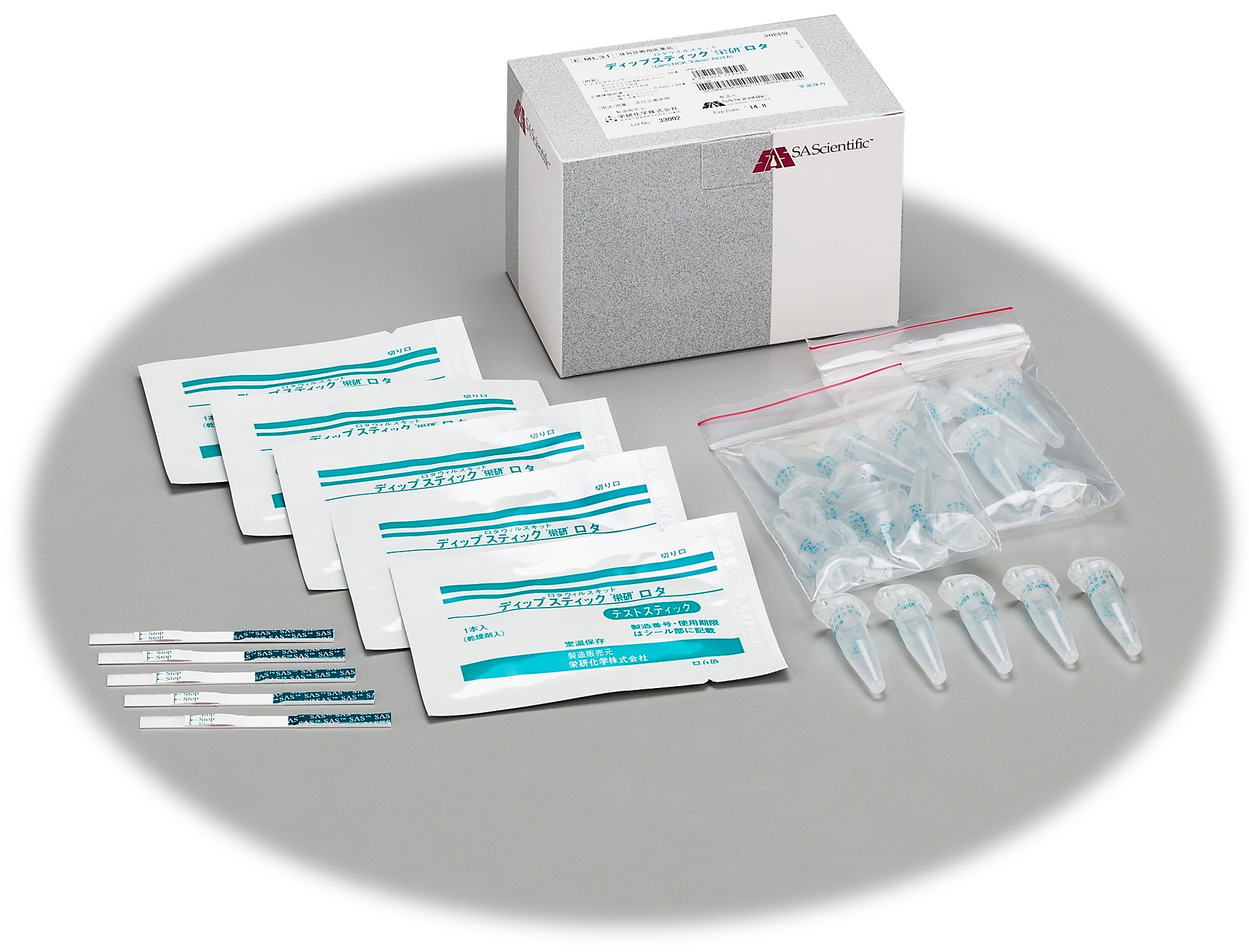 『ディップスティック ‘栄研’ロタ』は、金コロイドを用いた スティックタイプのイムノクロマトキットです。