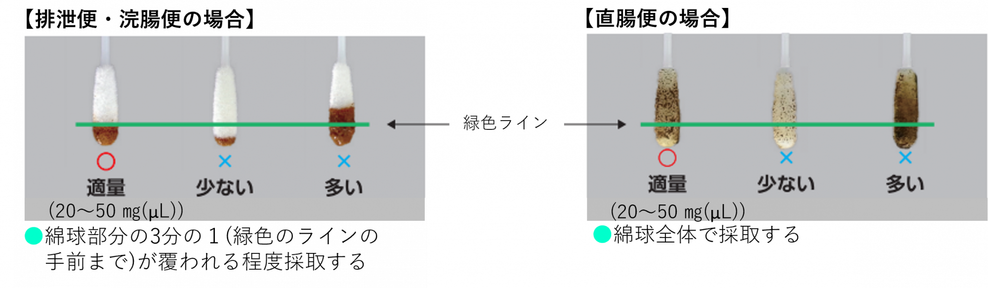 排泄便は綿球部分の緑色のライン手前を目安に採取