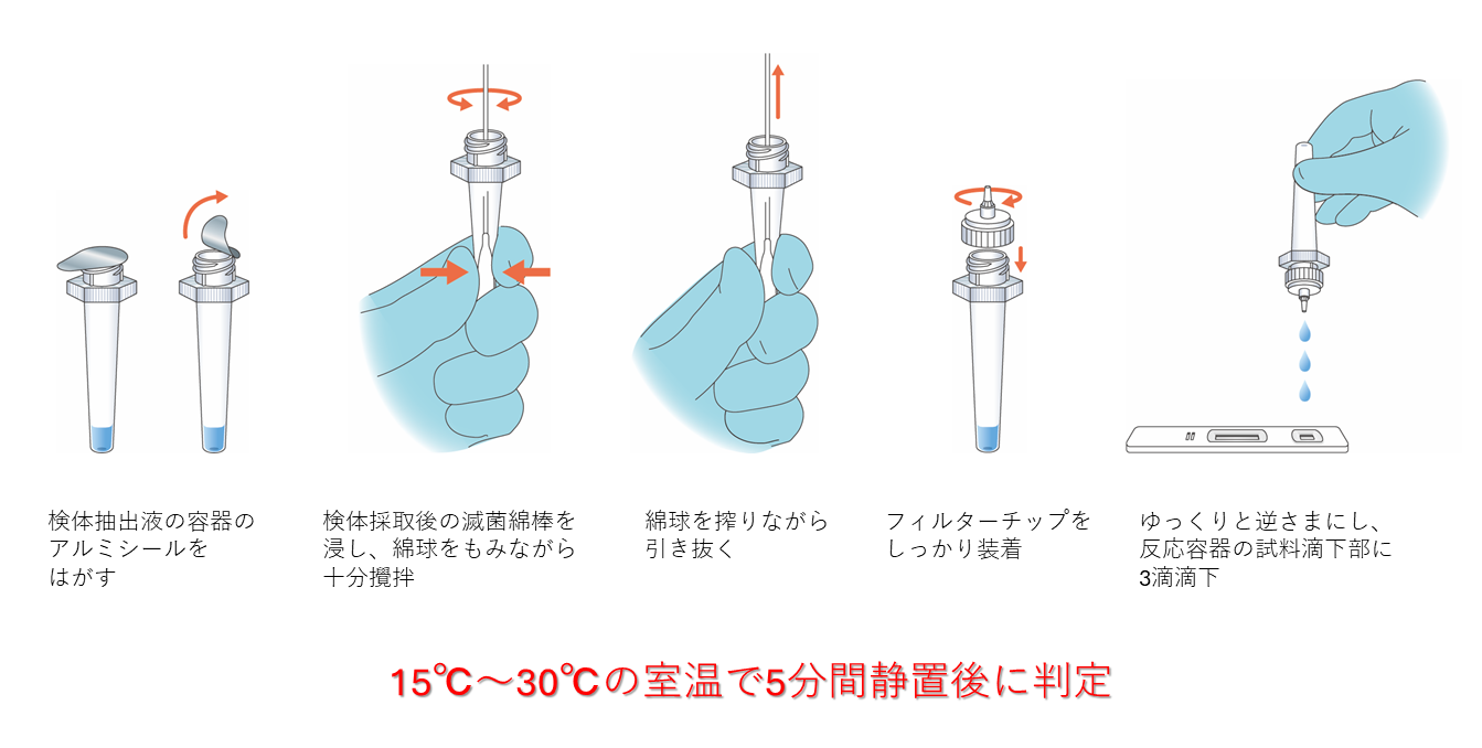 「イムノキャッチ®-Strep A」「イムノキャッチ®-Adeno」は、ともに検体抽出液を滴下後、5分間で判定が可能であり、2つの項目はまったく同じ操作ステップで検査を行うことができます。