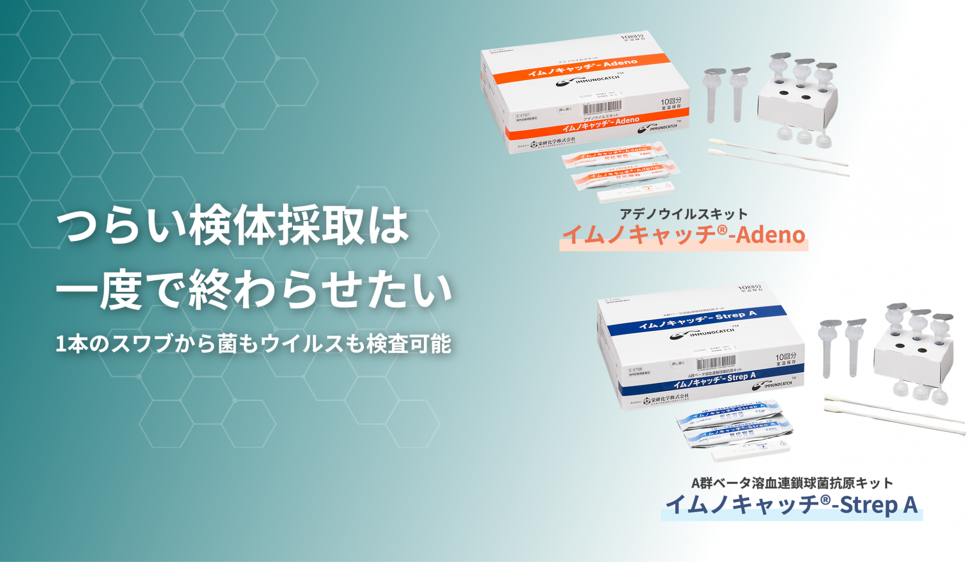 「イムノキャッチ®-Strep A」および「イムノキャッチ®-Adeno」は、これらキット間の抽出液共通化により、1本の咽頭ぬぐい液スワブから、A群β溶血連鎖球菌(溶連菌)とアデノウイルスの2項目の検査が可能なキットです。