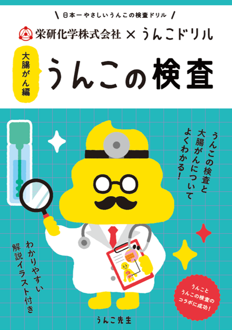 大腸がん検診の正しい知識を子供たちに知ってほしい、そして、子供たちに両親や祖父母など、身近な人の健康を願うきっかけになってほしいという想いから「栄研化学×うんこドリル うんこの検査~大腸がん編~」を制作しました。本冊子は、医師監修のもと大腸がん検診について楽しく学べるようになっています。